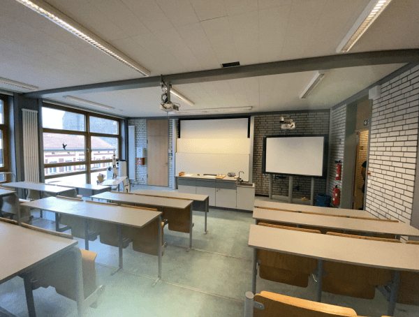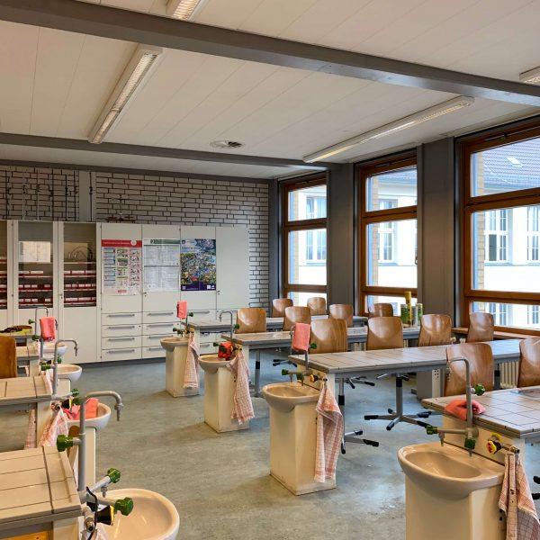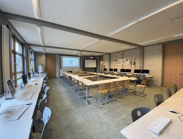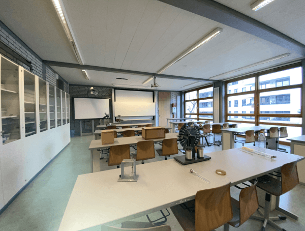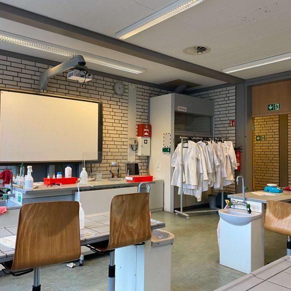Ergänzt wird das Ensemble durch einen schuleigenen Sportplatz und den hervorragend ausgestatteten Neubau mit den Fachräumen für Chemie, Physik, Musik und Informatik.