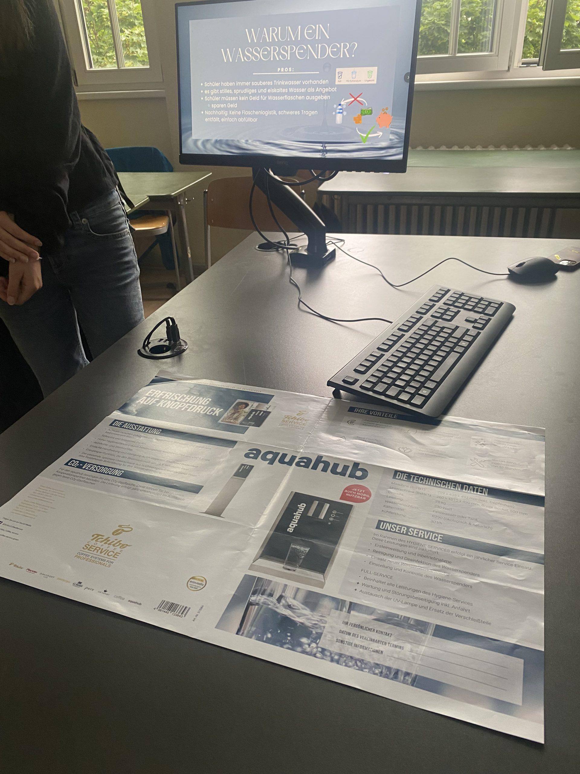 Die Gruppe hat sich mit der Frage befasst, wie der Verbrauch von Einwegflaschen an der FEO gesenkt werden könnte. Die Schultoiletten verfügen zwar über Wasserhähne, aus denen Trinkwasser in wiederbefüllbare Flaschen gefüllt werden könnte. Allerdings bestehen Vorbehalte wegen der hygienischen Bedingungen und auch sind die Wasserhähne nicht so installiert, dass manche Trinkflaschen dort problemlos befüllbar sind. Daraus entstand die Idee, Trinkwasserspender an der Schule zu installieren. So könnten alle Schüler*innen und Schüler wiederbefüllbare Flaschen nutzen und würden jederzeit sauberes Trinkwasser in hygienischer Umgebung erhalten. Nach Rücksprache mit der Verwaltungsleitung war zweifelhaft, ob eine Installation von Wasserspendern/ Wasserhähnen auf den Fluren möglich ist. Daher hat die Gruppe einen Wasserspender vorgestellt, der sowohl mit Festwasseranschluss als auch mit befüllbarem Wassertank verwendbar wäre.