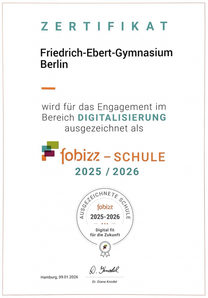 Am 9. Januar 2026 wurde dem Friedrich‑Ebert‑Gymnasium vom Hamburger Anbieter fobizz das Zertifikat „Kolleg:innen‑Fortbildung Künstliche Intelligenz (KI) und ihre Anwendungen im Unterricht“ verliehen. Diese Auszeichnung würdigt die kontinuierliche und intensive Auseinandersetzung unseres Kollegiums mit den Chancen und Herausforderungen von KI in Schule und Unterricht.